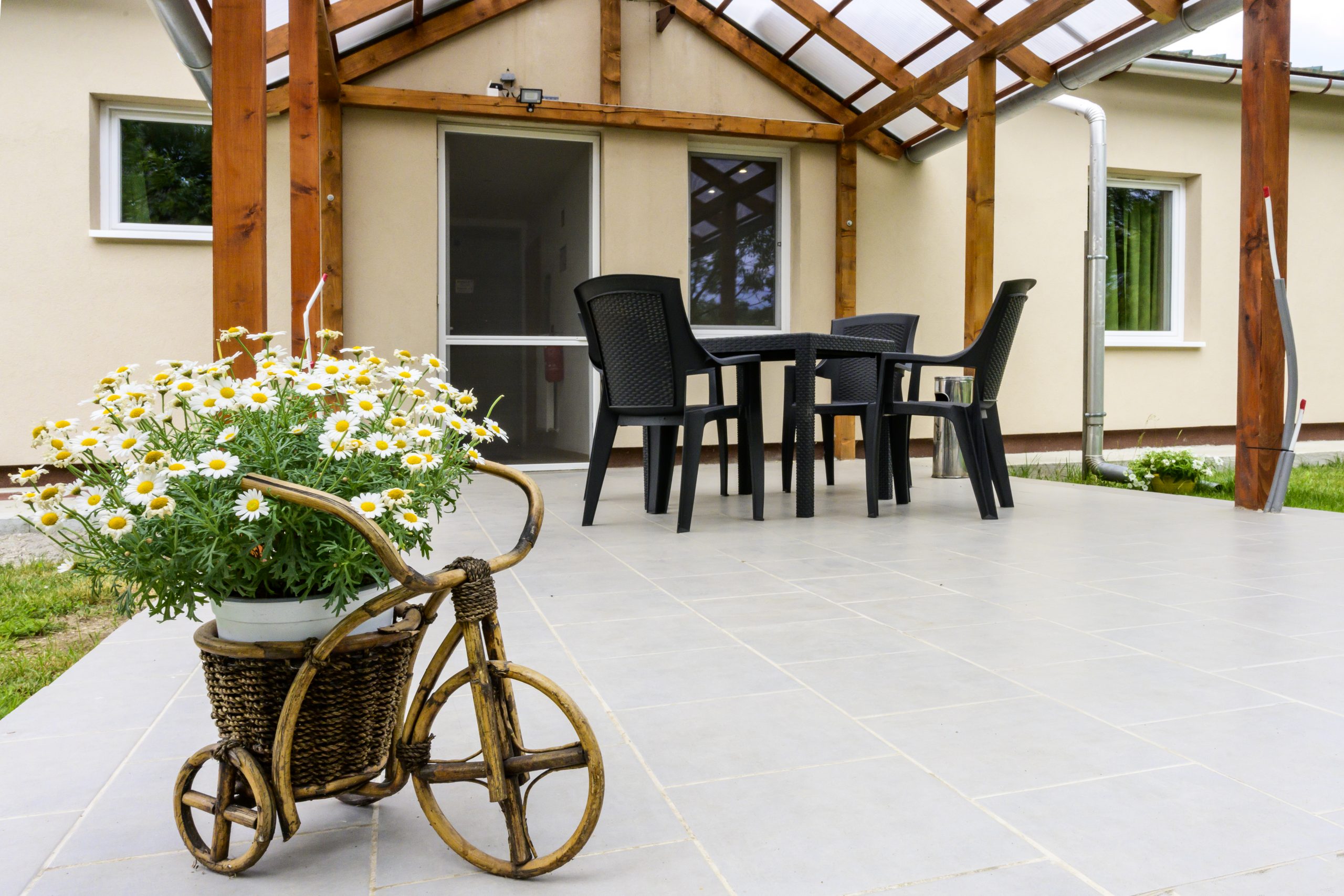 Földszinti kialakítású épületekben, parkosított, pihenésre alkalmas kerttel és tágas udvarral.